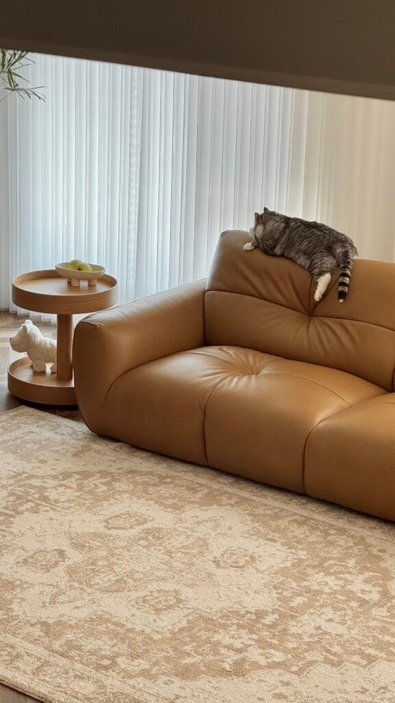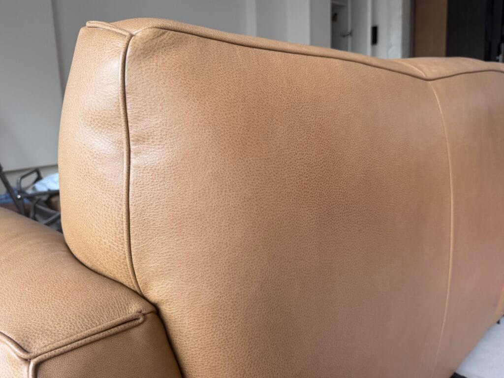 - The leathehide undergoes minimal processing, with a semi-aniline technique applied by hand. This process preserves the natural pore structure and soft handfeel of cowhide, ensuring each piece of leather retains its unique “fingerprint” (no two sofas will have identical textures).