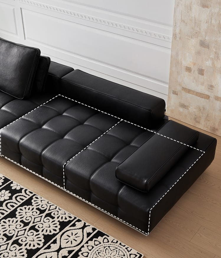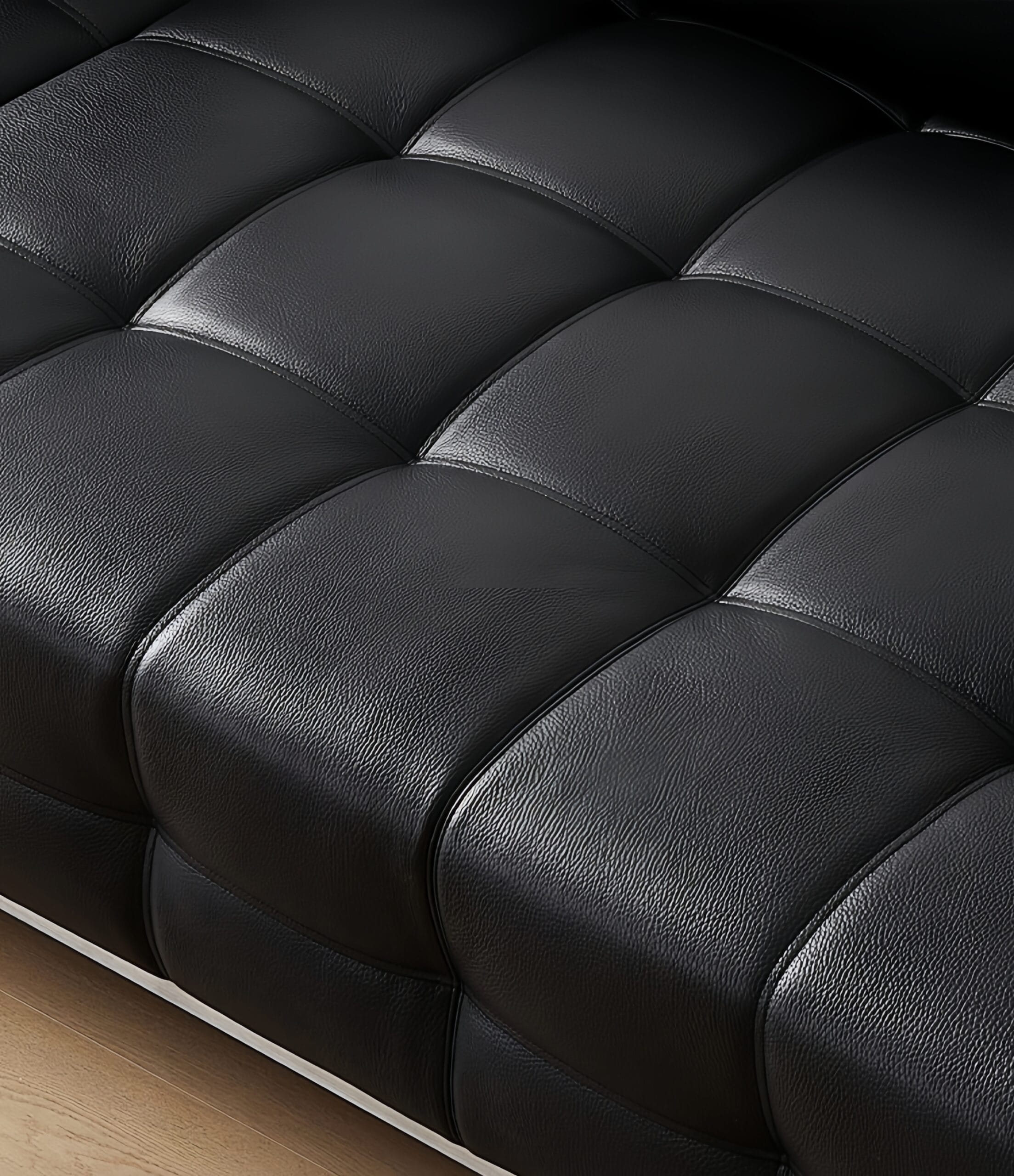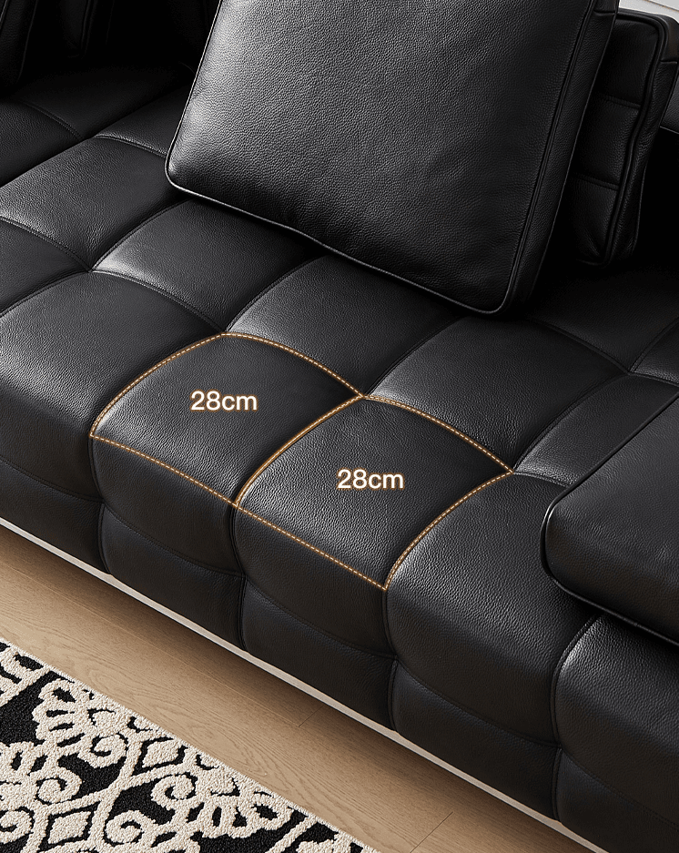 - Visual Harmony: The square grid pattern creates a sense of order and symmetry, which is visually calming and complements modern interiors. Unlike random tufting or chevron patterns, which can feel chaotic, the 28cm grid adds structure without being rigid. It also draws the eye across the sofa’s surface, highlighting the quality of the leather and the precision of the stitching.