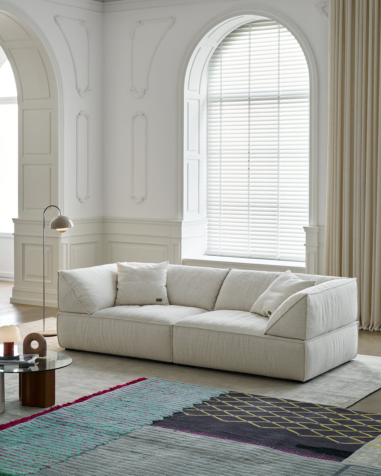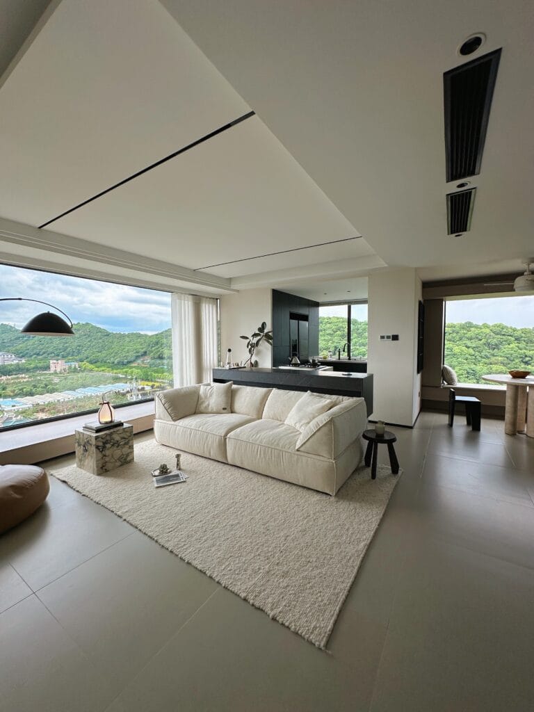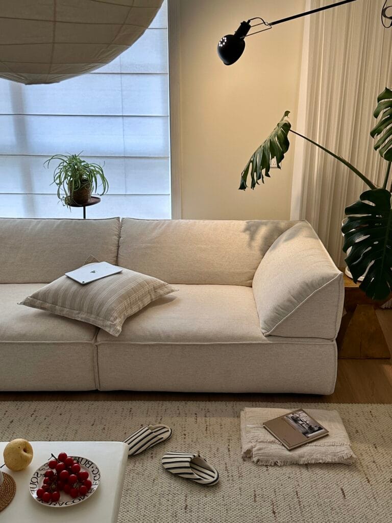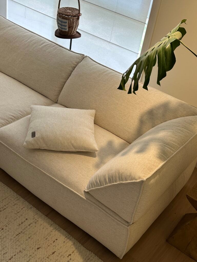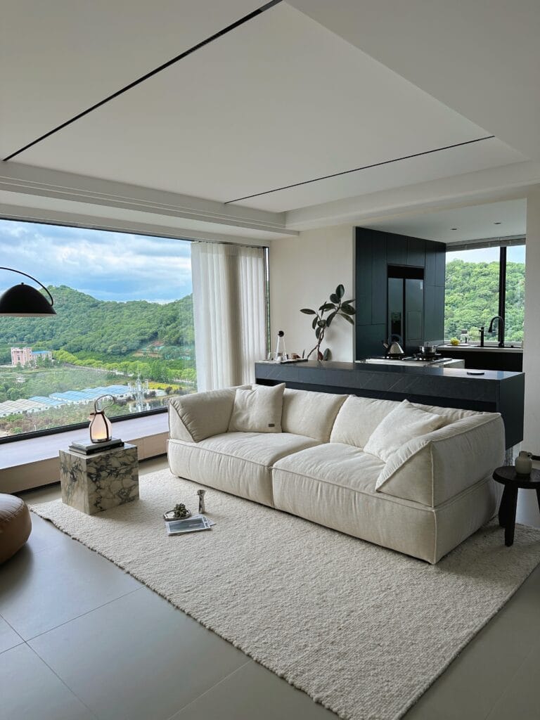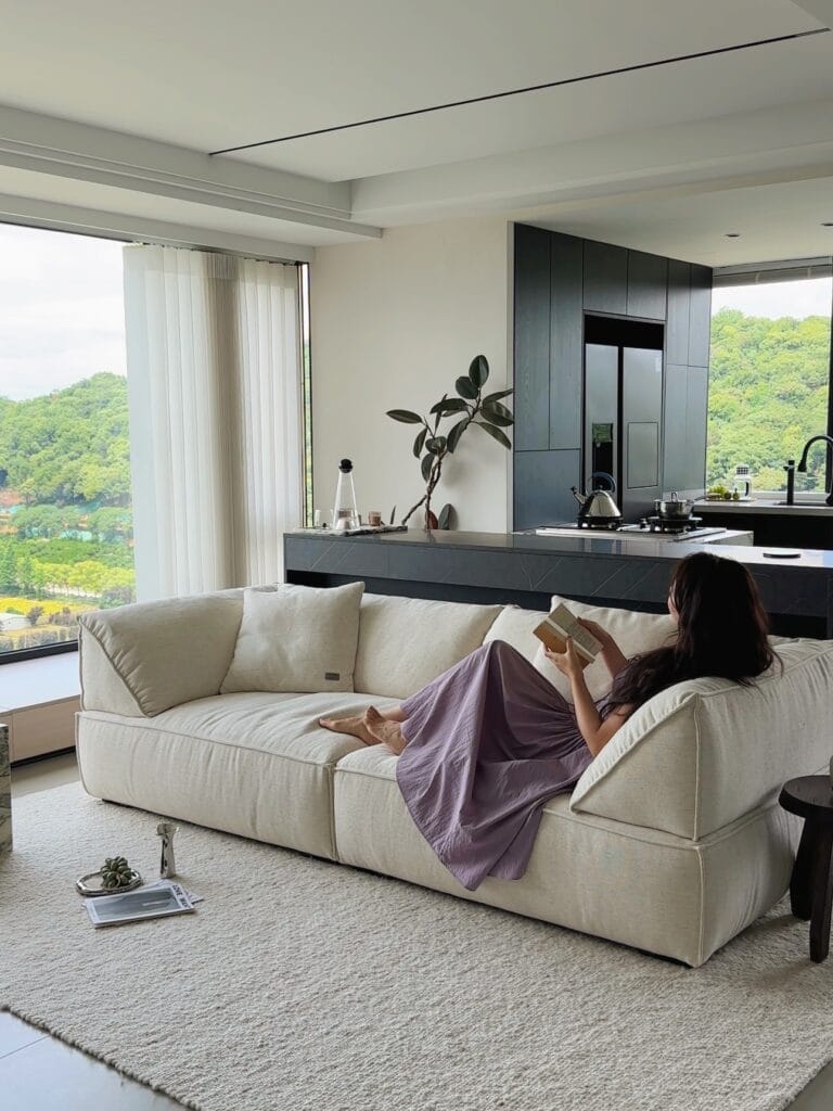 In a space defined by exposed concrete, steel accents, and large windows, the Livee Sofa brings a touch of softness and sophistication. Its geometric silhouette complements the loft’s architectural features, while the linen upholstery adds a layer of organic texture. Here, the sofa is not just a place to sit—it is a statement piece that elevates the entire space.
