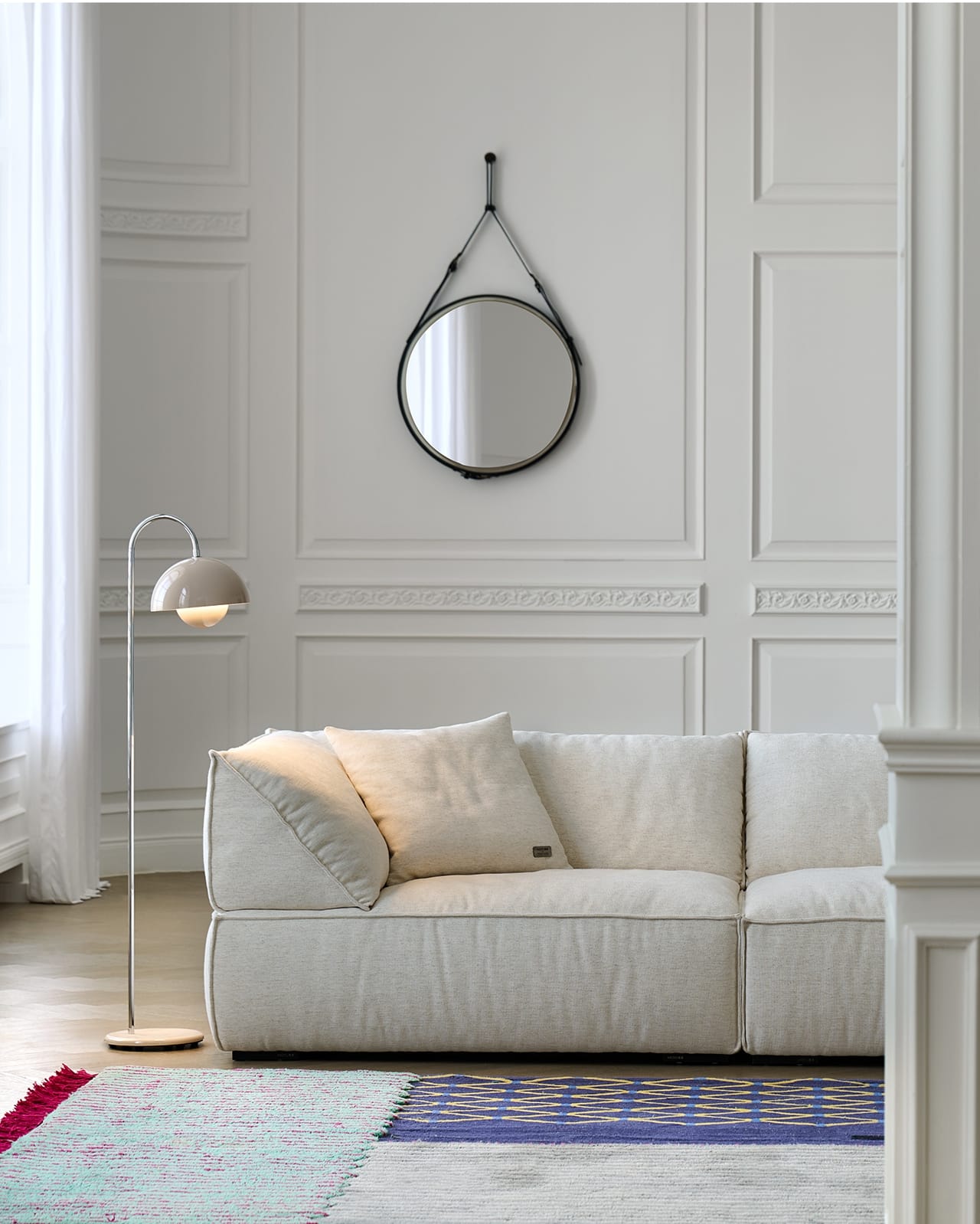 Imagine the Livee Sofa positioned in a room with ornate wall paneling, a gilded mirror, and a crystal chandelier. Its clean lines and neutral palette provide a modern counterpoint to the room’s traditional elements, creating a balanced, curated look that feels both timeless and contemporary. The RIVIERA linen’s natural texture adds warmth, while the sofa’s sculptural form serves as a focal point that ties the room together.