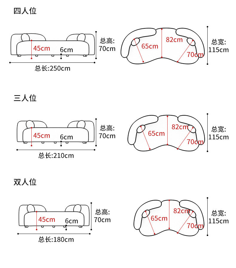 | Specifications | Loveseat (180cm) | Three-Seat (210cm) | Four-Seat (250cm) |