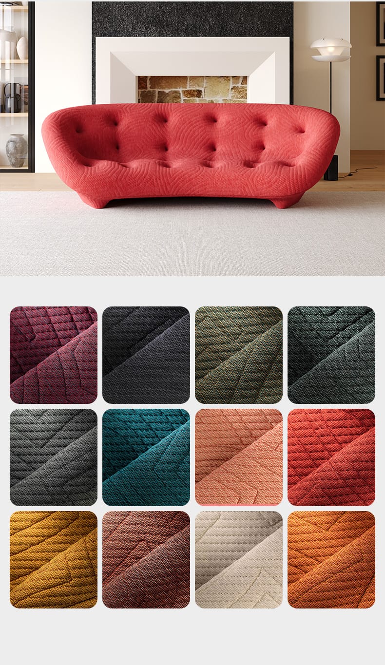 The Ploum Sofa’s upholstery showcases textile innovation, with three distinct 3D knitted fabric textures—each offering a unique sensory and visual experience.